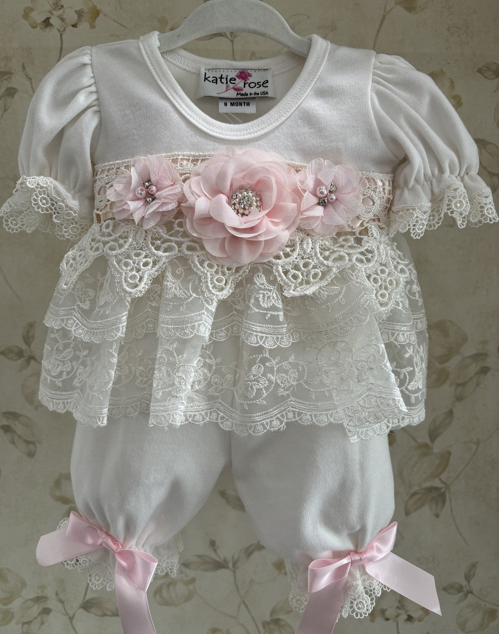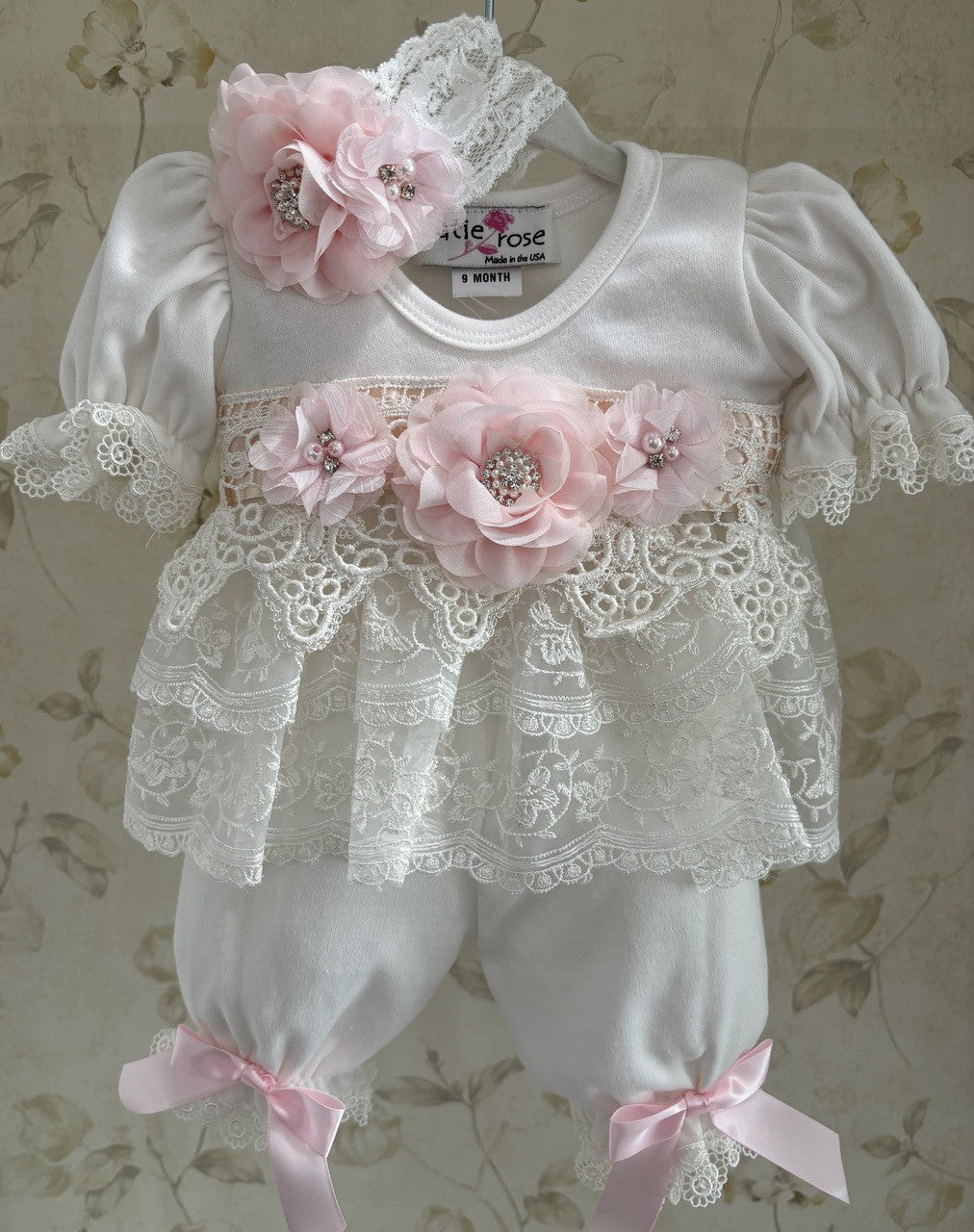 The Alia White Two Piece set provides luxurious comfort and a timeless look. Crafted from soft, white cotton, this set features delicate white lace and a beautiful flower bow. Complete with a matching headband, sold separately.