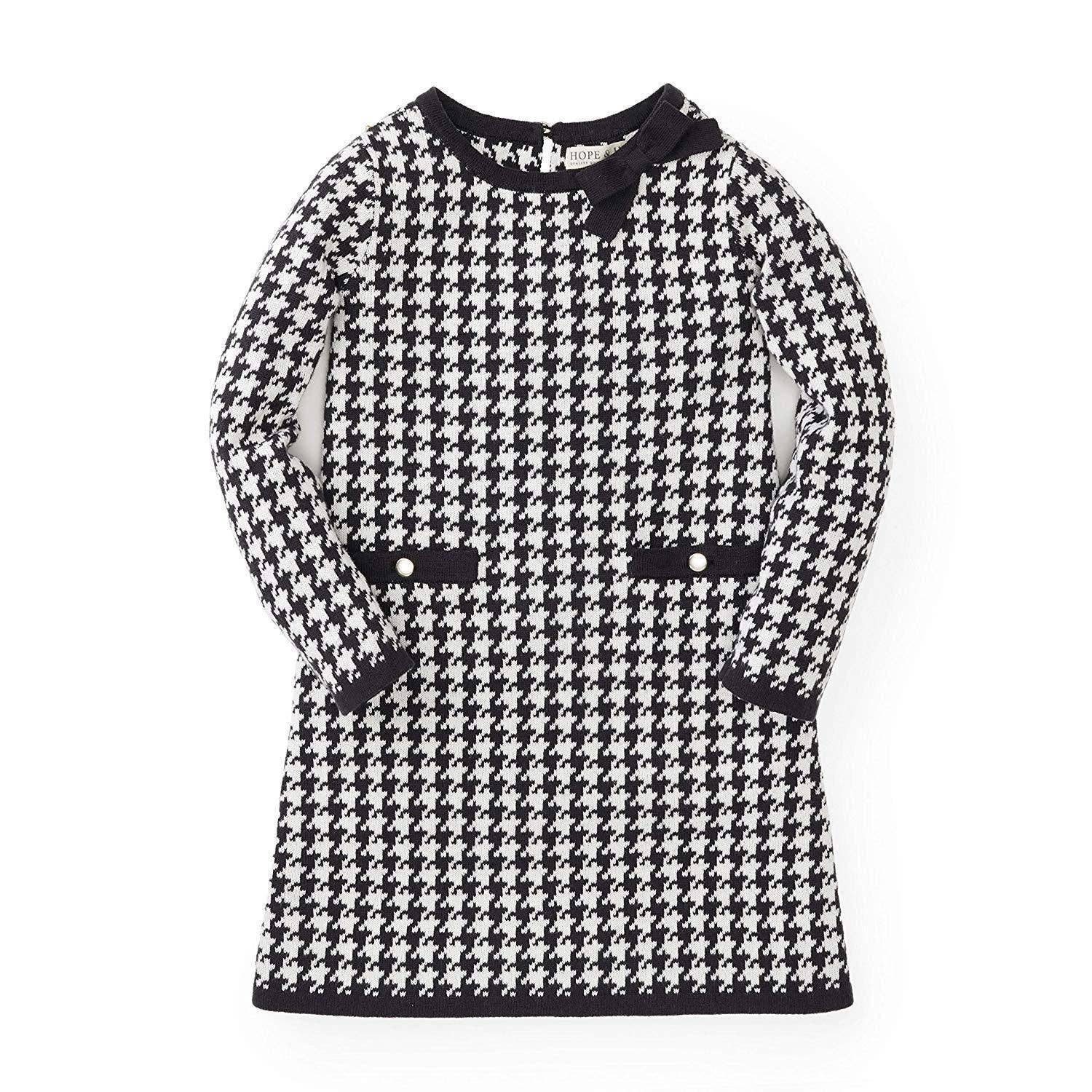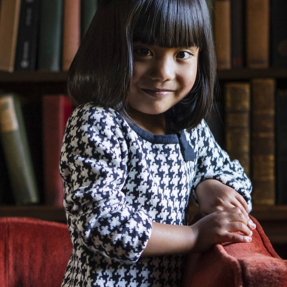 One of our top-selling sweater dresses in soft organic cotton will be your girl's go-to item for when temperatures drop. Features a beautiful cable knit, flattering A-line styling with long sleeves, elegant gold buttons at the decorative welt pockets, and a sweet bow detail at the neckline. This dress works for all occasions!
