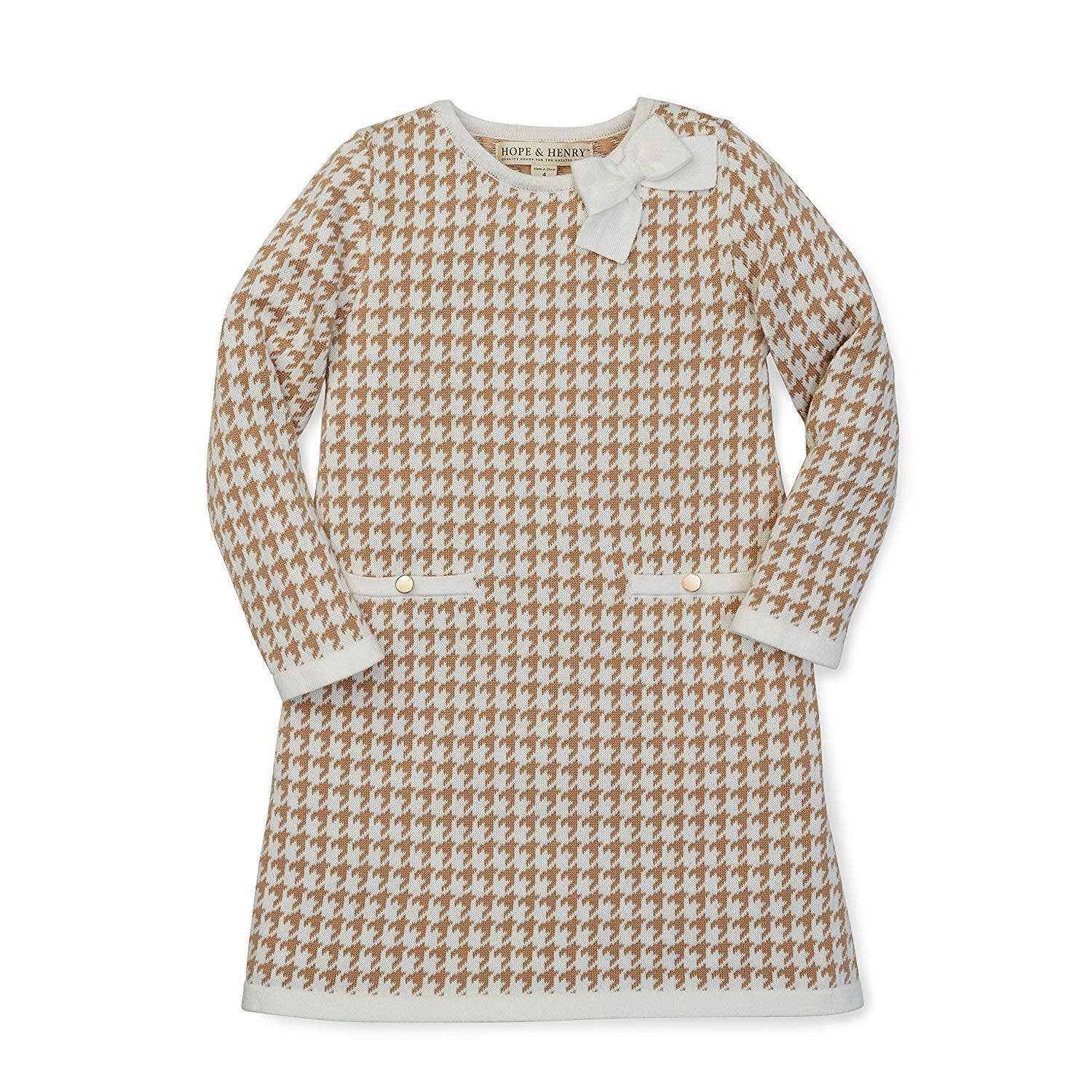 One of our signature sweater dresses in soft organic cotton will be your girl's go-to item for fall. Features flattering A-line styling with long sleeves, elegant gold buttons at the decorative welt pockets, and a bow detail at the neckline. So chic!