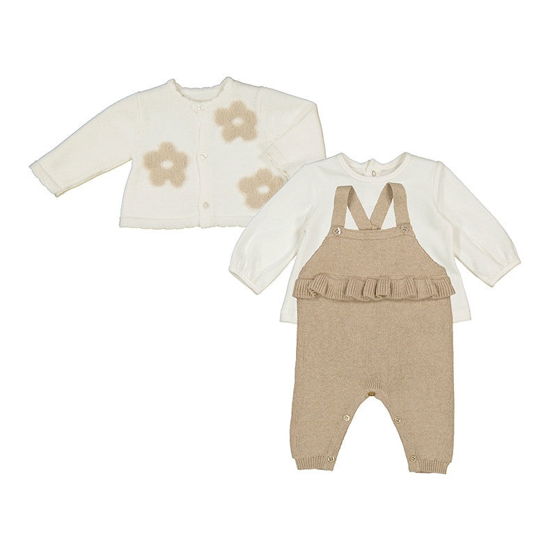 Mayoral Knit- 3 Piece Neutral Flower - Dungaree w/ Jacket Set