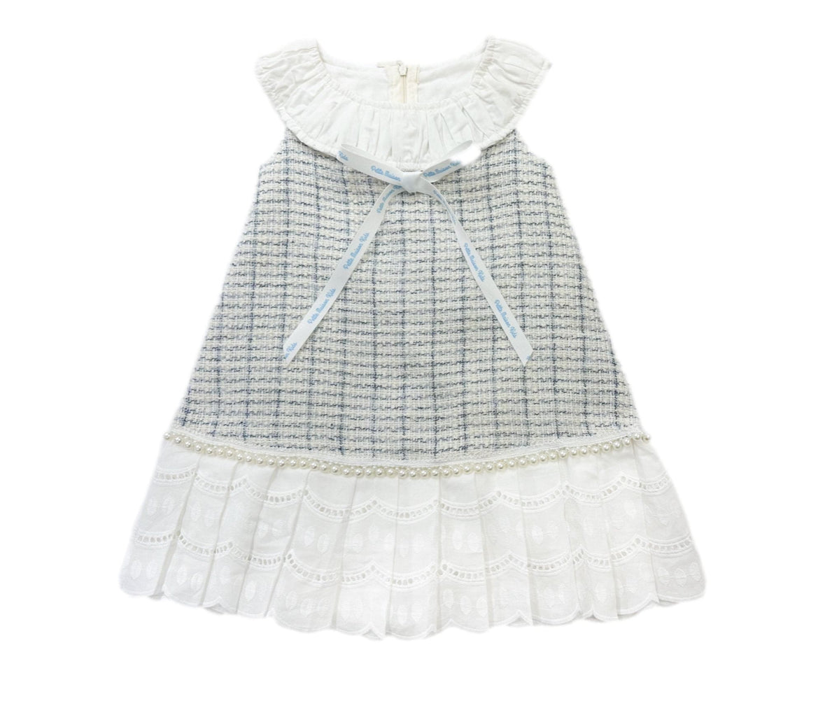 This stylish Iris Tweed Dress offers the perfect combination of tweed and cotton ruffle detail. The blue and ivory color tweed is paired with a white cotton skirt ruffle and pearl trim. Dress also features stylish logo print bow at the center. An elegant look for your little princess.