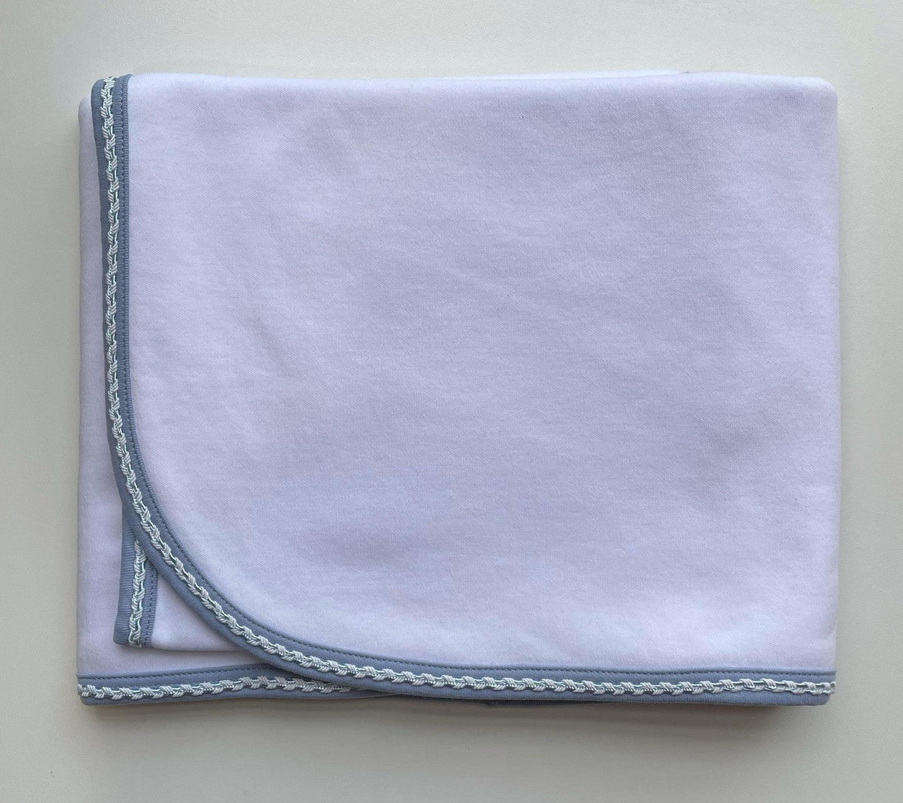 This beautiful receiving blanket is made of 100% Pima cotton with double layer to provide extra warmth. It is very soft and cuddly and keeps your baby warm all day. The blanket is available in white with gray edge.